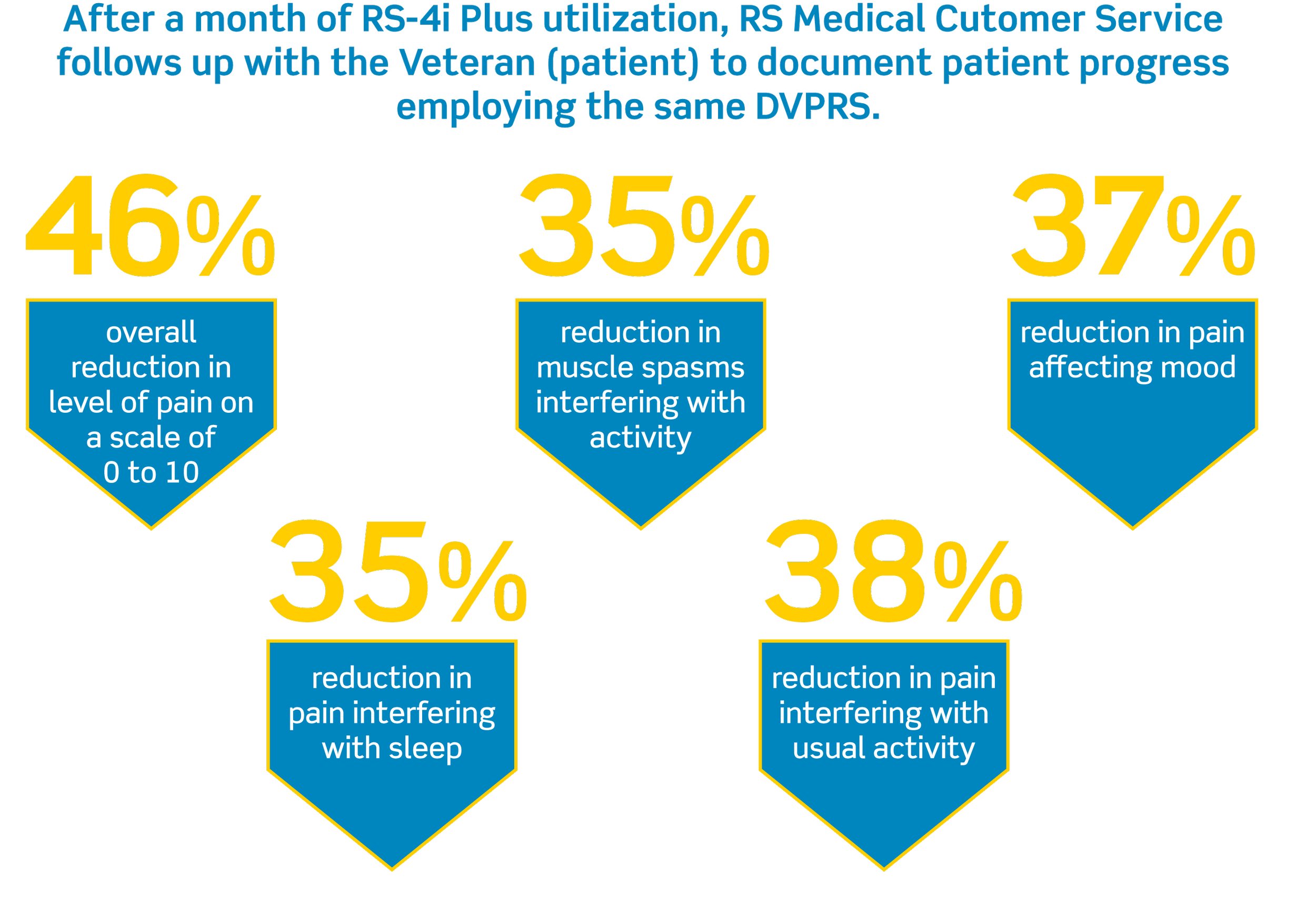 **This account summary of 31,820 RS-4i Plus Patient Assessments includes patient-reported data both before (Baseline) and after (21+ day follow-up) incorporating the use of the RS-4i Plus into their treatment protocol. Data was collected from patients by RS Medical representatives in person and over the phone. The Assessment questions used have been adapted from the Defense & Veterans Center for Integrative Pain Management (DVCIPM) Defense & Veterans Pain Rating Scale (DVPRS) and Supplementary Questionnaire.