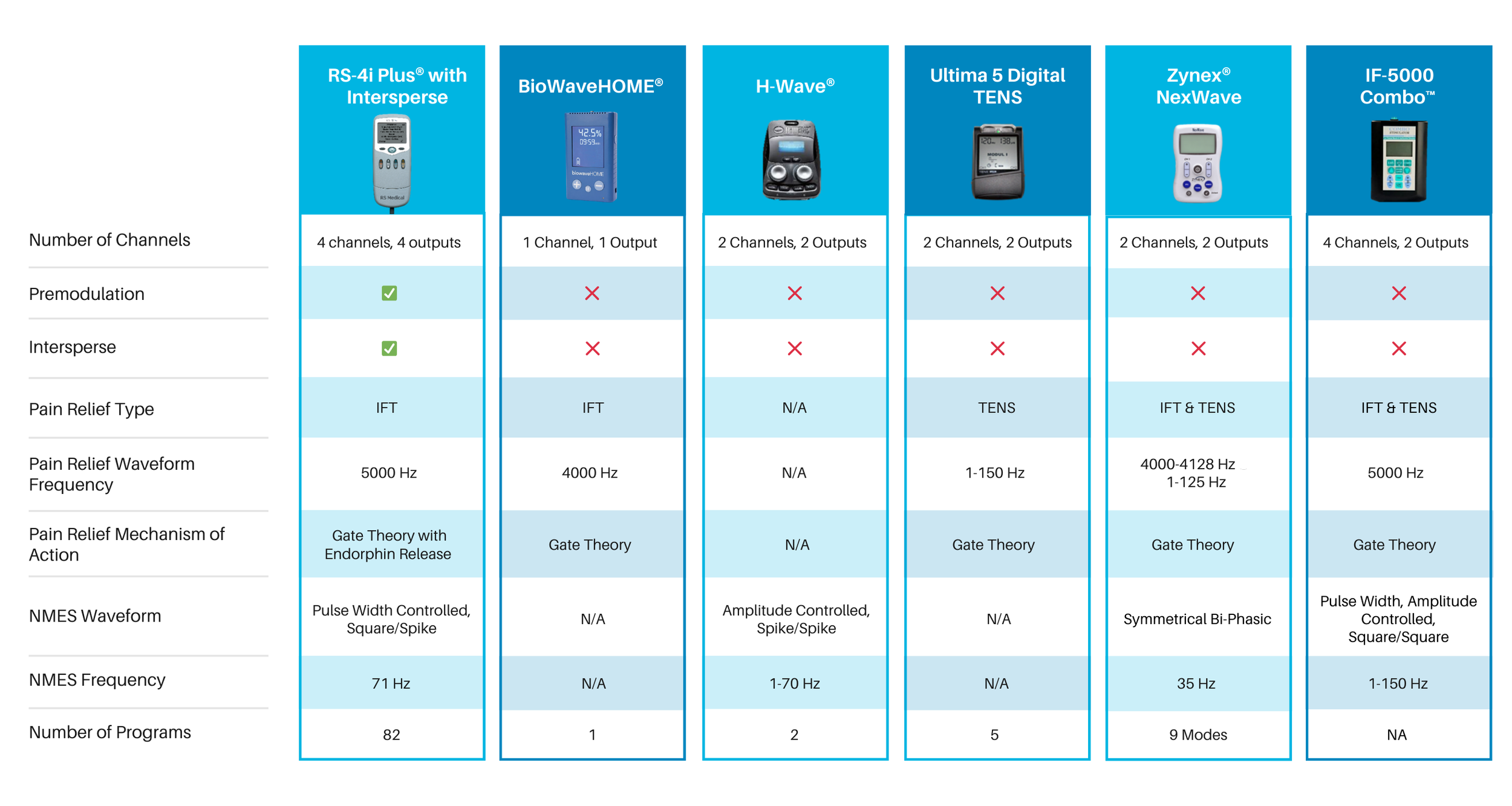 Additionally, premodulation allows the RS-4i Plus to transition between Interferential treatments and NMES treatments without repositioning the electrodes, which is required for devices without this technology. The added ease-of-use for patients can increase treatment compliance and in turn, improve effectiveness. It is also what enables the RS-4i Plus to utilize patented Intersperse technology, which intermixes IFT and NMES treatments into a single session.