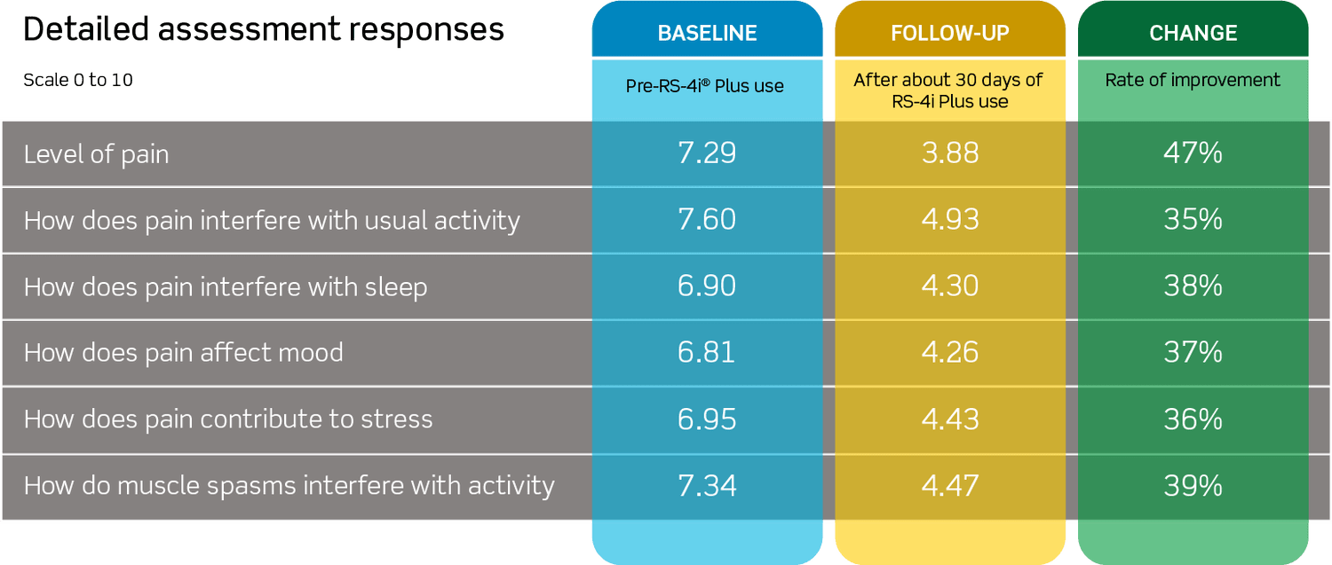 We have collected data from over 30,000 patients after 30 days of treatment using assessment questions adapted from the Defense & Veterans Pain Rating Scale (DVPRS).